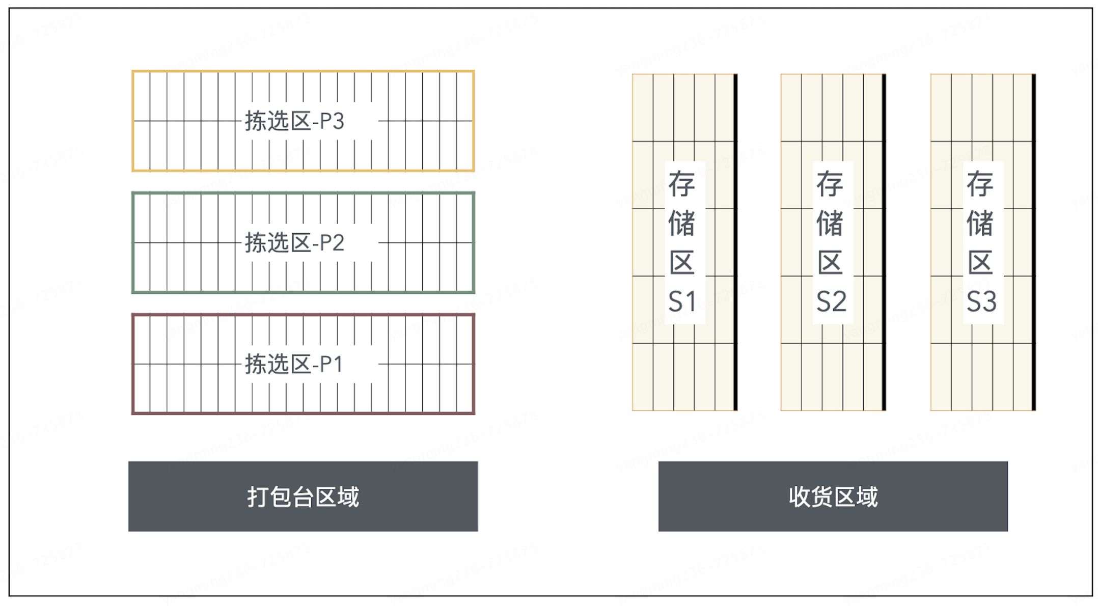 在商品已经到达仓库后,系统设计中的上架推荐策略是优化仓储空间利用、提升拣货效率、减少存货积压以及加快商品周转的关键。下图是一个仓库的示意图: