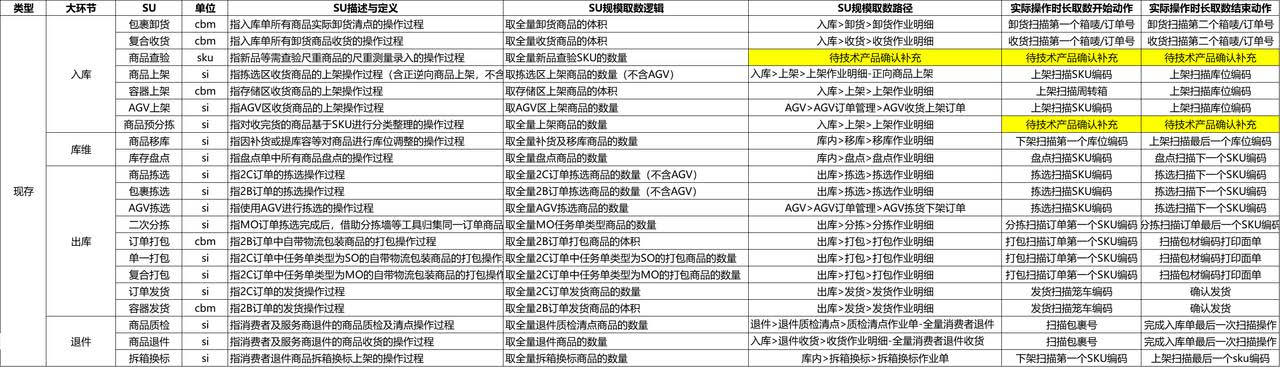 - 标准工时:按各环节SU对应的工作量(体积或数量),by货型去关联对应的效率,得到标准工时(如下图各环节SU取数逻辑)
